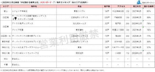 不動産ビッグデータでビジネス展開するスタイルアクト株式会社(東京都中央区・代表取締役:沖有人)は、首都圏のマンションのうち、資産性の保たれやすさを確率で示した指数「沖式儲かる確率」のエリア別上位マンションランキング2025年11月版を自社が運営する「住まいサーフィン( https://www.sumai-surfin.com/ )」にて公表しました。