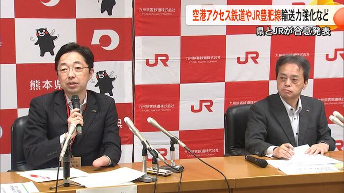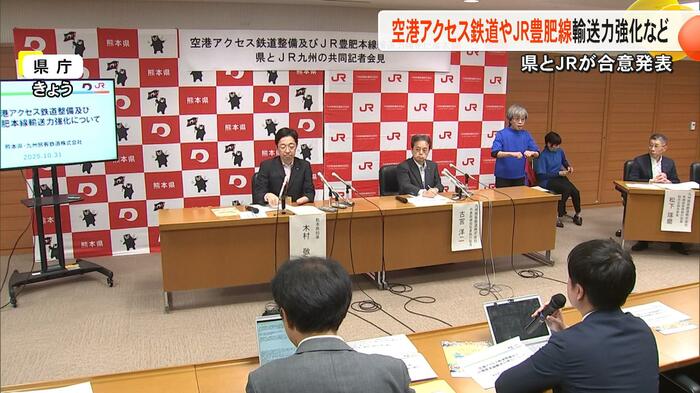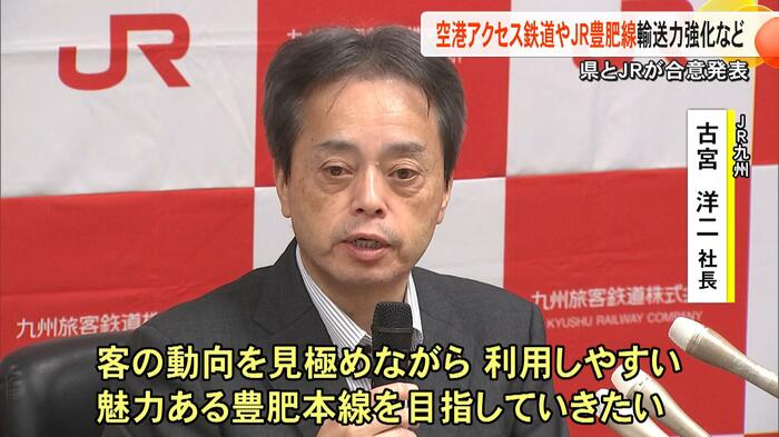 10月31日朝、木村知事と、JR九州の古宮洋二社長が記者会見を開き、空港アクセス鉄道の整備とJR豊肥線の輸送力強化について、4つの項目で協力して取り組むことに合意したと発表した。