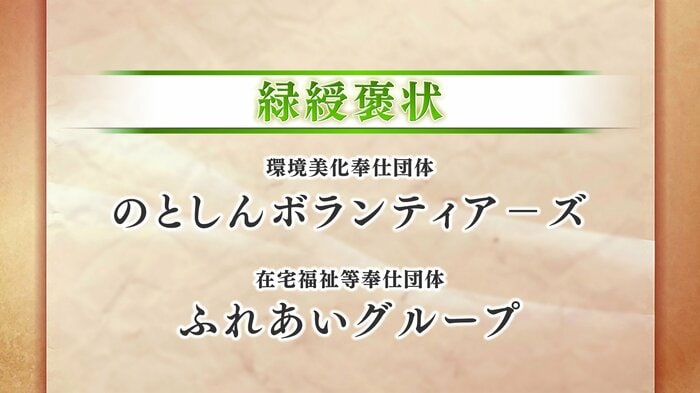 奉仕活動で社会に貢献した団体に贈られる緑綬褒状は、環境美化奉仕団体で七尾市の「のとしんボランティアーズ」と、在宅福祉等奉仕団体で小松市の「ふれあいグループ」が選ばれました。