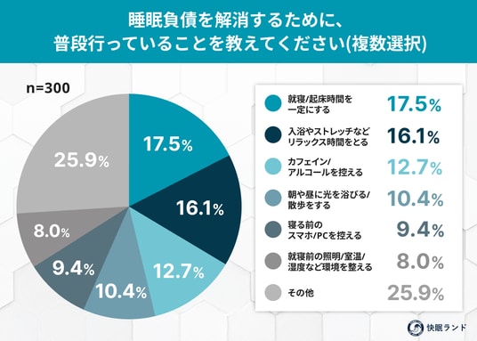 - 睡眠負債解消法の最多は「就寝・起床時間を一定にする」(17.5%)