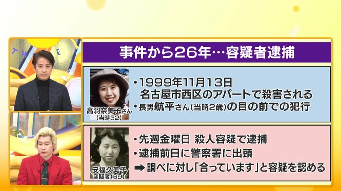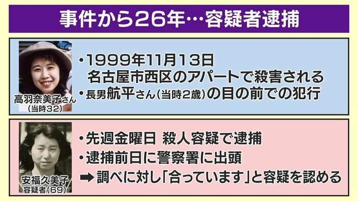 1999年11月、愛知県名古屋市西区のアパートで、高羽奈美子さん(当時32歳)が長男の航平さん(当時2歳)の目の前で、首などを複数回刺され殺害された事件。