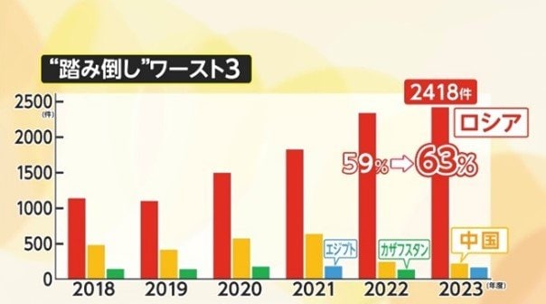 警察庁から独自に入手したリストによると、過去の違反に対する“踏み倒し”は、国別ではロシアのワースト1位が続いていて、2023年度は2418件と、過去6年で最悪となった。