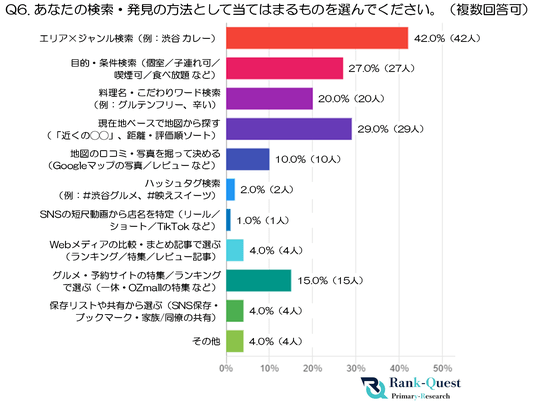 - 「料理名・こだわりワード検索(例:グルテンフリー、辛い)」は20.0%(20人)で、特定の好みやテーマに沿って店を探す人も一定数存在します。