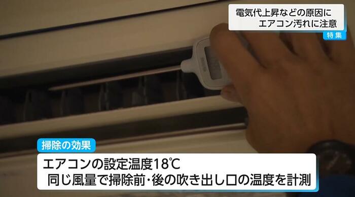 洗浄前と洗浄後で、エアコンの吹き出し口付近の温度を比較する実験を行ってみたところ、設定温度18℃、同じ風量で測定した結果、洗浄前は10℃だったものが、洗浄後は8.5℃まで低下した。