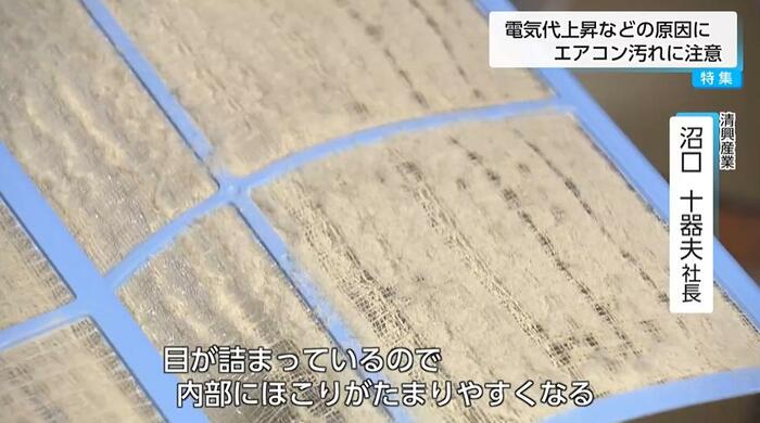 この夏、ほとんどつけっぱなしにしていたエアコンのカバーを外してみると・・フィルターにほこりがびっしり。沼口さんは、「フィルターの目が詰まっていると、内部にホコリがたまりやすくなる」と指摘する。
