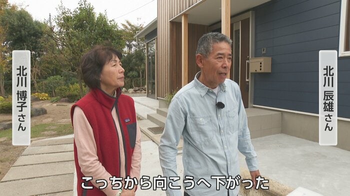 「こっちから向こうへ下がった」と北川さん。妻の博子さんは「傾き(沈み)は24センチ。解体は公費。(建てる費用の)市からの補助はほんの1割に満たない」と語る。