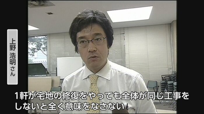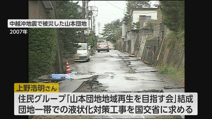 上野さんは団地の住民に呼びかけ「山本団地地域再生を目指す会」を結成。団地一帯で液状化対策工事を進めるため、当時、国土交通省などに直接補助を要望した。「1軒が宅地の修復をやっても全体が同じ工事をしないと全く意味をなさない」と上野さんは説明していた。