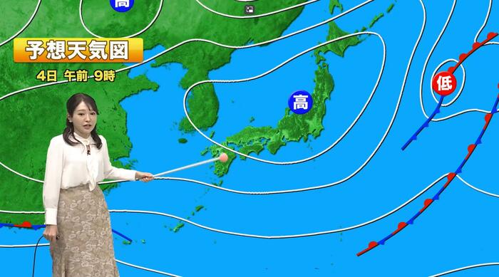 4日午前9時の予想天気図を見ると、日本の北にドーンと大きな高気圧があります。この高気圧に覆われるため晴れるのですが、ポイントはその「位置」です。