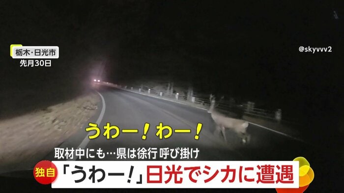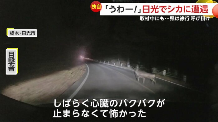 栃木・日光市の山道で10月、車の前に飛び出してきたシカの姿がカメラに捉えられた。