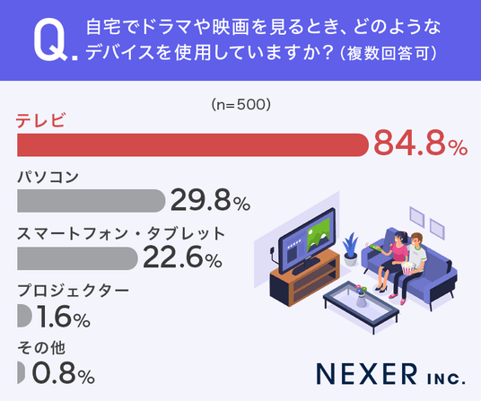 自宅でドラマや映画を視聴する際、回答者の84.8%が「テレビ」を利用していました。