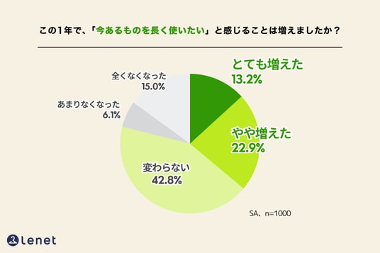 その結果、「とても増えた」「やや増えた」と答えた人は合わせて36.1%となり、約3人に1人が“モノを大切に使う”意識の高まりを実感していることがわかりました。