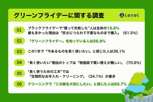 株式会社ホワイトプラス(本社 東京都品川区、代表取締役社長 井下孝之、以下「当社」)が提供する宅配クリーニング「Lenet(以下、リネット)」は、全国の20代~60代の男女1000人を対象に、「クリーニングとグリーンフライデーに関する意識調査」を2025年10月にインターネットで実施しましたので、その結果をお知らせいたします。