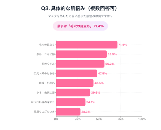 その結果、最も多かったのは「毛穴の目立ち」で71.4%、次いで「赤み・ニキビ跡」(58.9%)、「肌のくすみ」(56.2%)という結果になりました。