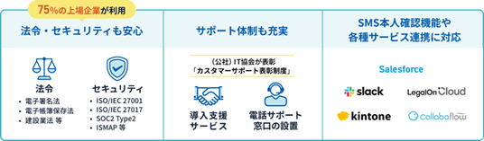 電子帳簿保存法や建設業法などの各種法令に加え、国内外の第三者機関によるセキュリティ認証の取得により、高い安全性を評価されているほか、SMS本人確認機能や他の業務サービス・基幹システムとの連携に加え、導入時の支援サービスや、誰もがご利用いただける電話サポート窓口の設置等、サポート体制も充実しています。