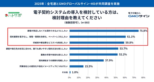 電子契約サービス「電子印鑑GMOサイン」を提供するGMOグローバルサイン・ホールディングス株式会社(代表取締役社長:青山 満 以下、GMOグローバルサイン・HD)と、宅建協会会員業務支援サイト「ハトサポ」を運営する公益社団法人全国宅地建物取引業協会連合会(会長:坂本 久 以下、全宅連)は、このたび、不動産事業者を対象に不動産取引における電子契約の実態に関する共同調査を実施しました。GMOグローバルサイン・HDと全宅連による共同調査は2023年にも実施されており、今回で2回目となります(※1)。2022年5月に施行された改正宅地建物取引業法(以下、改正宅建業法)により、不動産取引における電子契約の利用が可能となってから3年以上が経過しました。本調査を通じて、不動産取引における電子契約の利用状況や課題についての実態が判明しました。