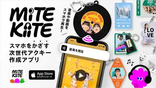 MiTE KiiTEは、交通系ICカードやタッチ決済に活用されているNFC(近距離無線通信)技術を搭載した“機能付きアクリルキーホルダー”を作成できるサービスです。スマホをかざすだけで予め登録した動画や音楽、メッセージ、URLなどを読み込むことができ、幅広い用途に利用いただけます。MiTE KiiTEは登録機能だけでなくデザインもカスタマイズできるので、自分好みの便利なキーホルダーを手軽に作ることができます。