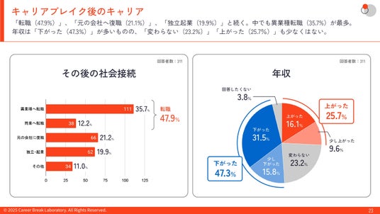 異業種転職が35.7%と最多だが、21.2%は元の会社に復帰していることがわかる。年収は、半数弱が下がっているものの、変わらない24%、上がったも25%存在している。