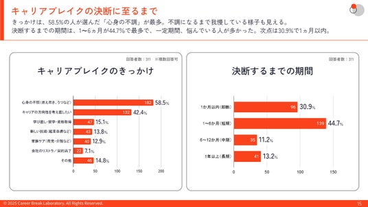 キャリアブレイクを決断するきっかけは「心身の不調(燃え尽き、うつなど)」が58.5%と最も多く、「キャリアの方向性を考え直したい」と続いた。