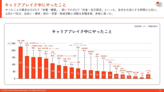 キャリアブレイク期間中にやったこととして7割以上の人が「休養・睡眠」と回答。次いで「人間関係の見直し・新しい出会い」「内省・自己探求(瞑想、リトリート、など)」「趣味・創作活動(音楽、アート、執筆など)」「旅行」などを約半数の人が行っていたことがわかった。学習やリスキリング、資格取得、企業準備、地域活動やワーケーション、運動・スポーツや家事・育児など、バラエティに富んだ。