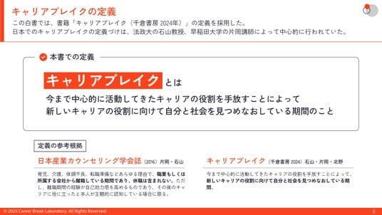 アメリカやイギリスなどの欧州では辞書や Wikipediaにも掲載されており、すでに一般化した言葉である「キャリアブレイク」。同研究所では中心的に研究を行っている法政大学大学院政策創造研究科教授 石山恒貴氏、早稲田大学グローバルエデュケーションセンター講師 片岡亜紀子氏と代表北野による共著『キャリアブレイク(千倉書房2024年)』の最新定義を採用します。