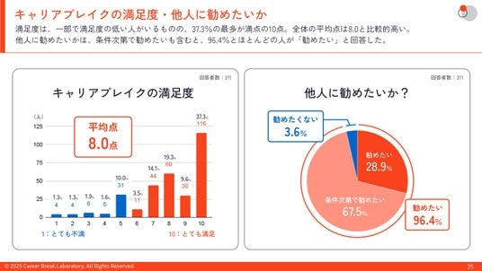 満足度が高かった経験者からは、「15年くらいは自分の土台になるような経験資本ができた。また、それを家族と共有できていること」(30代男性)、「立ち止まる時間で、自分の軸を取り戻せた。もし立ち止まる期間がなければ、燃え尽きていたかもしれない」(40代女性)といった理由が聞かれた。
