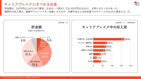 キャリアブレイク中の収入源は、半数以上が「失業手当や公的資金」と回答しており、期間(下記データ参照)との相関性も推測される。