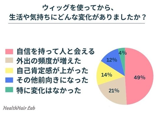 ウィッグを使用してからの生活や気持ちの変化について伺ったところ、『自信を持って人と会える(49%)』『外出の頻度が増えた(21%)』『自己肯定感が上がった(14%)』『その他前向きになった(12%)』『特に変化はなかった(4%)』という回答が集まりました。