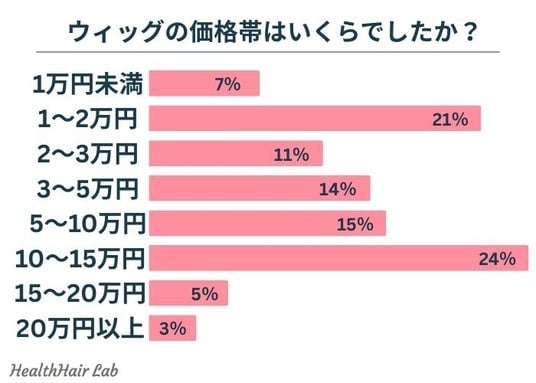 購入した医療用ウィッグの価格帯について伺ったところ、『1万円未満(7%)』『1~2万円(21%)』『2~3万円(11%)』『3~5万円(14%)』『5~10万円(15%)』『10~15万円(24%)』『15~20万円(5%)』『20万円以上(3%)』という回答が集まりました。