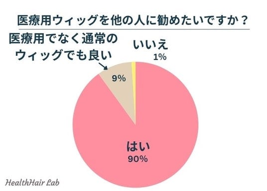 医療用ウィッグを他の人に勧めたいか伺ったところ、『はい(90%)』『医療用でなく通常のウィッグでも良い(9%)』『いいえ(1%)』という回答が集まりました。