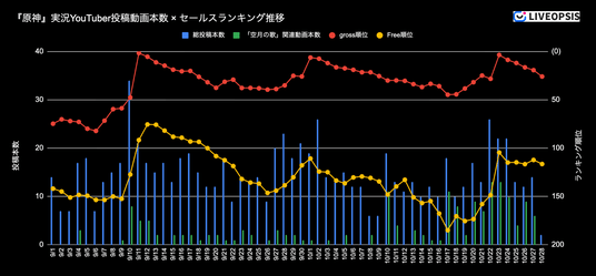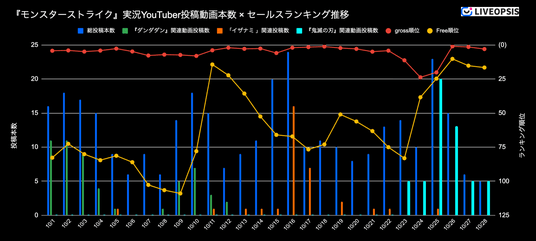 LIVEOPSIS|実況YouTuber投稿動画本数 × セールスランキング推移(総投稿本数とイベント関連ワード別)
