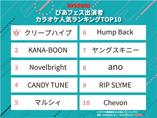 さらに、「PIA MUSIC COMPLEX 2025」の豪華出演陣の中から、今、カラオケで最も歌われているアーティストのランキングTOP10を発表します。フェスの熱気そのままに、会場だけでなくカラオケでもファンが熱唱している注目のアーティストを一挙紹介します。
