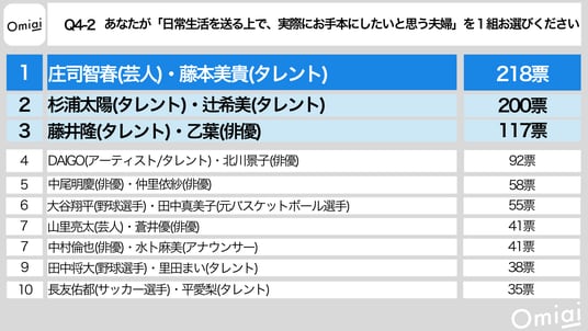 一方、「日常生活を送る上で実際にお手本にしたい」として最も多く選ばれたのは「庄司智春さん・藤本美貴さん」夫婦。テレビやSNSで見せるリアルでほほえましい気持ちになる夫婦の掛け合い・マイペースな様子に 「自分たちもああなりたい」と親しみを覚えた方が多いと考えられます。