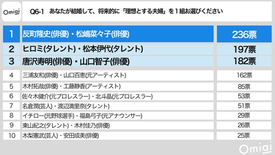 【Q6】 「反町隆史・松嶋菜々子」夫婦が「理想の先輩夫婦1位」、「ヒロミ・松本伊代」夫婦が「お手本にしたい先輩夫婦1位に」