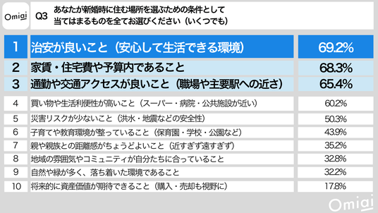 新婚時に住む場所を選ぶ条件では、 1位「治安の良さ」(69.2%) 2位「家賃が予算内」(68.3%) 3位「交通アクセス」(65.4%)となりました。また、具体的に住みたい町の自由記述では、吉祥寺や武蔵小杉、浦和、川崎、千葉などのアクセスや生活利便性の良さ、都心と比較して高すぎない家賃相場、といったバランスの取れた駅が人気で、一般的に上位にくると想像される恵比寿・表参道などはランク外でした。キラキラした生活よりも、現実的で安心できる暮らしを優先。愛情と同じくらい、“穏やかな日常”を大切にしたいと考えていることが想定されます。