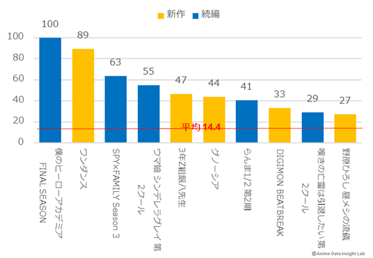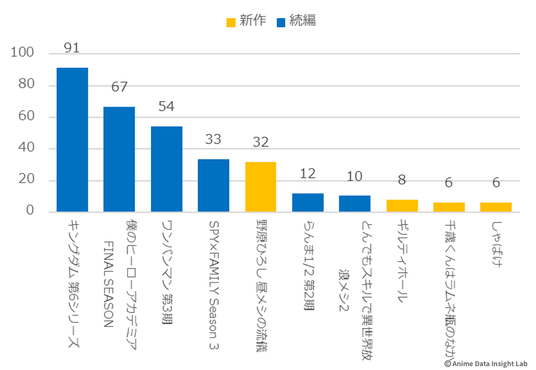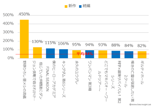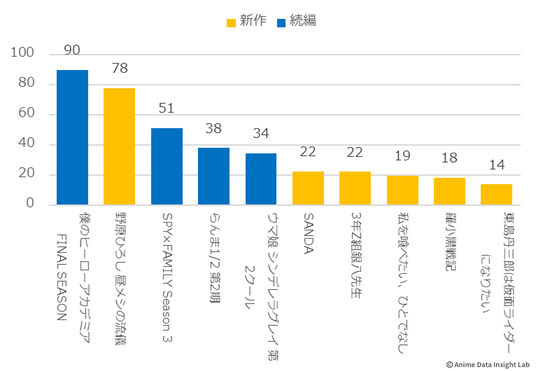 大型続編の『僕のヒーローアカデミア FINAL SEASON』(115%)と『キングダム 第6シリーズ』(106%)も、初週を上回る注目度を維持しており、シリーズファンの継続的な支持を得ている。