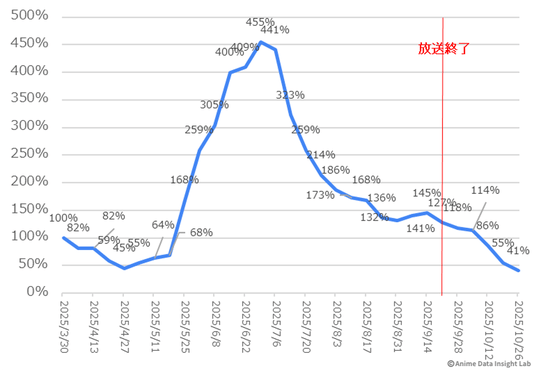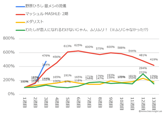 今季最大のサプライズは『野原ひろし 昼メシの流儀』の450%という過去最高の伸びだ。初週は控えめなスタートだったが、3週目には急上昇し、初週比4.5倍という数値を記録した。SNSでの口コミ効果が徐々に広がり、「クレヨンしんちゃん」の人気キャラクターを主人公にしたスピンオフ作品への注目が加速度的に高まっていることがわかる。