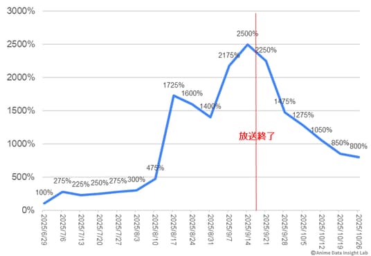 『銀河特急 ミルキー☆サブウェイ』はさらに劇的で、8週目に1725%という驚異的な伸びを記録。TikTokで特定のシーンやセリフ、楽曲が繰り返し拡散され、一部ではミーム化した。その結果、放送終了後も継続的に高い数値を維持している。