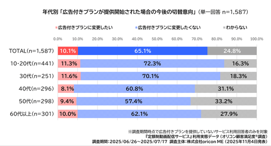 つづいて、調査期間の時点で広告付きプランを提供していないサービス利用者1,587人を対象に『広告付きプランが提供開始された場合の今後の切替意向(単一回答)』を聴取したところ、全体で「広告付きプランに変更したくない」が6割以上、なかでも年代別「10・20代」「30代」では7割以上となりました。