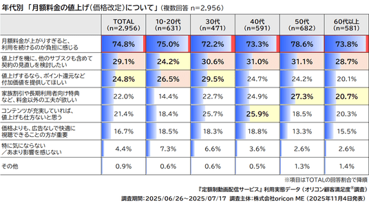 月額料金の値上げ(価格改定)について“継続が負担に感じる”が7割以上 “コンテンツ充実なら仕方ない”が上位のサービスも
