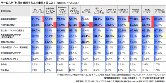 2025年 『定額制動画配信サービス』 利用実態データ |利用を継続する上で重視すること U-NEXT利用者は「動画本数の豊富さ」の割合が81.6%で特に高い傾向に(オリコン顧客満足度(R)調査)