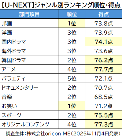 ジャンル別ランキングでは、「邦画(73.8点)」と「お笑い(71.2点)」の2部門で1位となりましたが、得点の面では「アニメ(77.7点)」部門が最も評価が高く、次いで、「オリジナルコンテンツ(77.3点)」「韓国ドラマ(76.2点)」「スポーツ(75.5点)」「国内ドラマ(74.1点)」部門において高い得点を得ています。