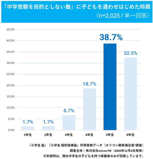 オリコン株式会社(本社:東京都港区 代表取締役社長:小池 恒、略称:オリコン)は、グループ会社である株式会社oricon MEが、実際のサービス利用者を対象に第三者の立場で実施した11月発表の『小学生 塾/個別指導塾』『中学受験 塾/個別指導塾/公立中高一貫校対策 塾』満足度ランキングの調査対象者6,506名に、別途聴取し集計した利用実態データを2025年11月4日(火)14時に発表しました。