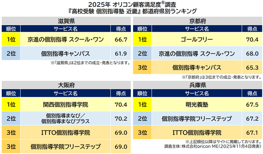 『高校受験 個別指導塾 近畿』都道府県別ランキング(2025年 オリコン顧客満足度(R)調査)