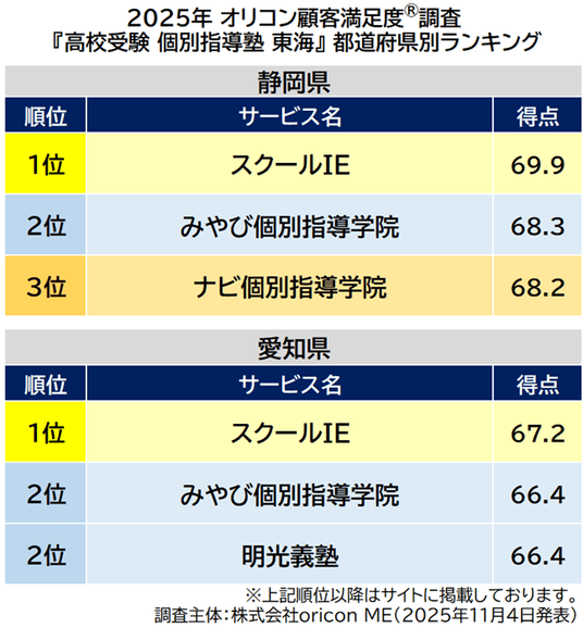 『高校受験 個別指導塾 東海』都道府県別ランキング(2025年 オリコン顧客満足度(R)調査)