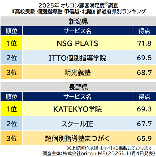 『高校受験 個別指導塾 甲信越・北陸』都道府県別ランキング(2025年 オリコン顧客満足度(R)調査)