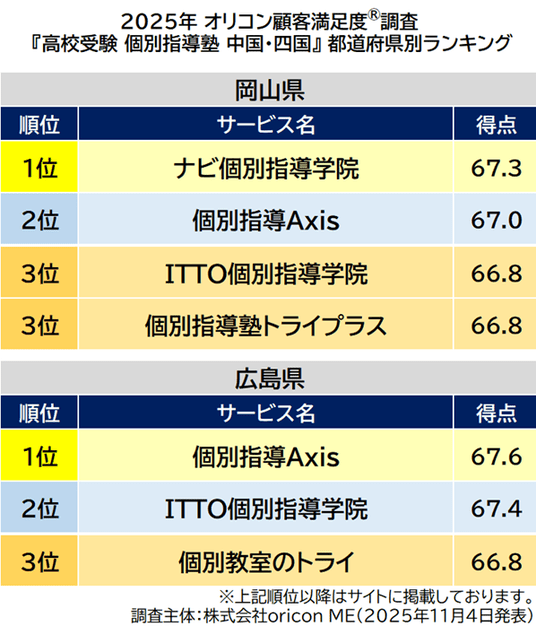 『高校受験 個別指導塾 中国・四国』都道府県別ランキング(2025年 オリコン顧客満足度(R)調査)