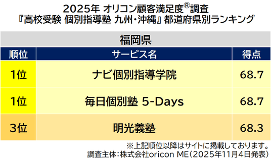 『高校受験 個別指導塾 九州・沖縄』都道府県別ランキング(2025年 オリコン顧客満足度(R)調査)