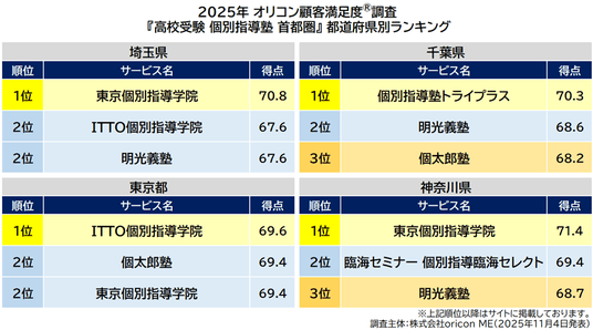 『高校受験 個別指導塾 首都圏』都道府県別ランキング(2025年 オリコン顧客満足度(R)調査)