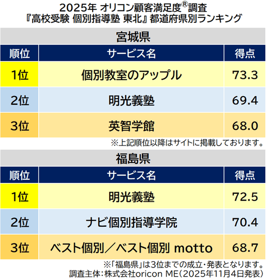 『高校受験 個別指導塾 東北』都道府県別ランキング(2025年 オリコン顧客満足度(R)調査)