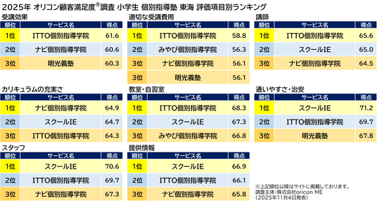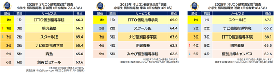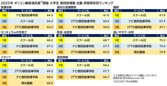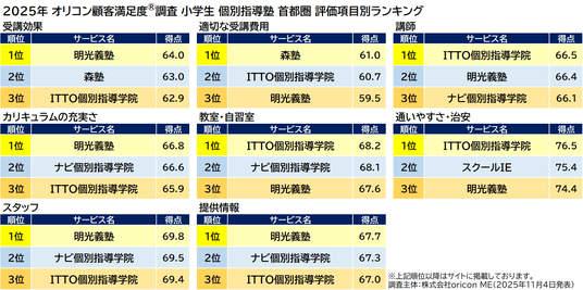 オリコン株式会社(本社:東京都港区 代表取締役社長:小池 恒、略称:オリコン)は、グループ会社である株式会社oricon MEが、実際のサービス利用者を対象に第三者の立場で実施した、小学生向け 個別指導塾についての満足度調査を実施し、2025年11月4日(火)14時にその結果を「オリコン顧客満足度(R)」公式サイト内( https://life.oricon.co.jp/ )にて発表いたしました。ランキングの結果は以下の通りとなりました。